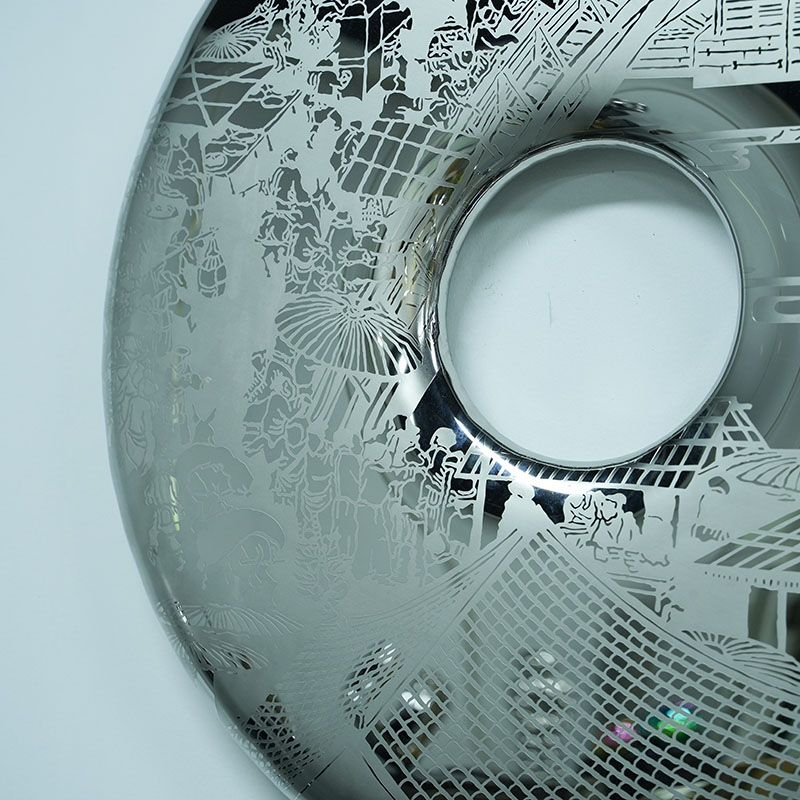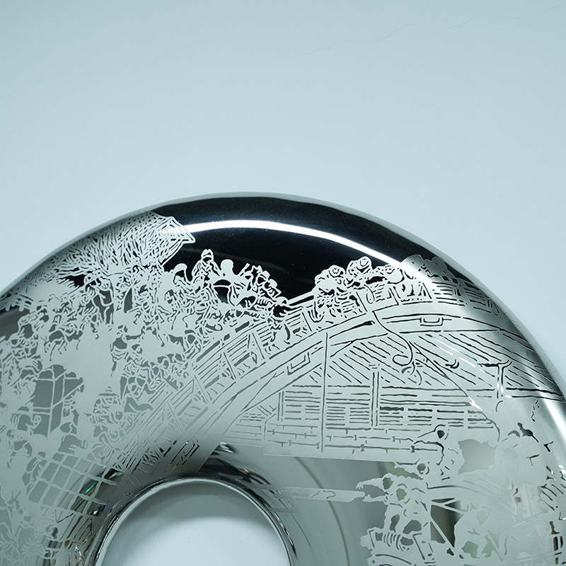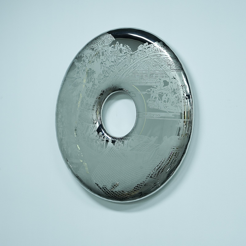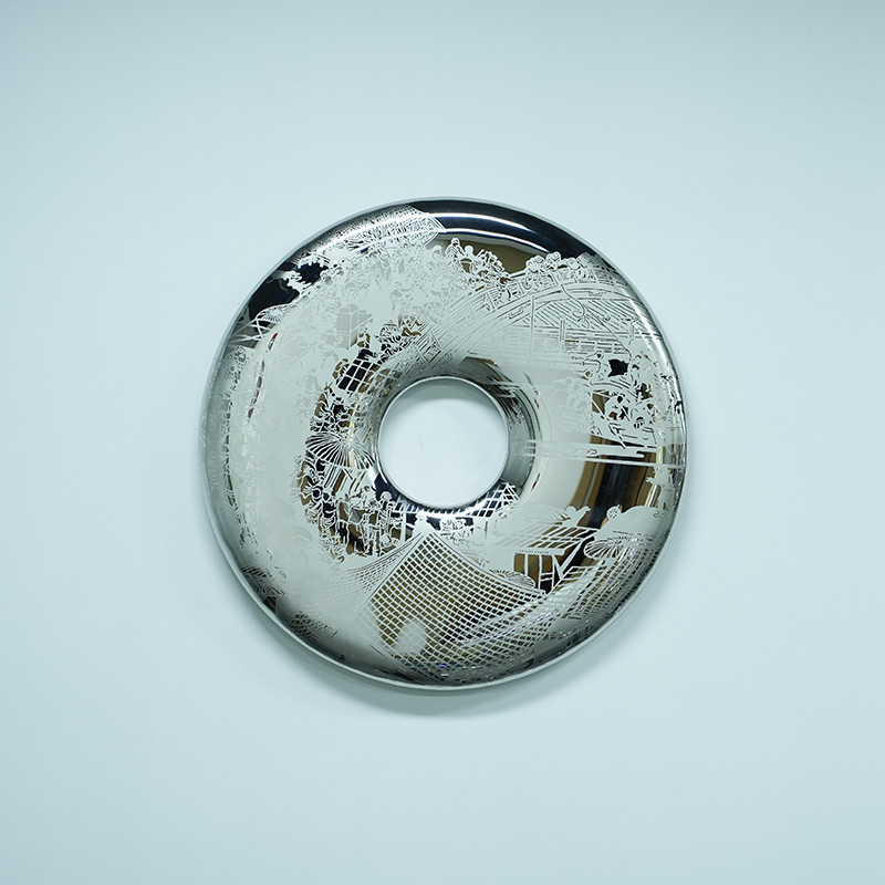 The “Ancient Mirror Ring” is a stainless steel sculpture that combines tradition and modernity. Its design is inspired by the ancient Chinese jade bi, which symbolizes eternity and perfection. The traditional landscape patterns finely carved on the surface of the sculpture are combined with the smooth mirror texture, giving the work a profound cultural connotation and the beauty of modern art.
