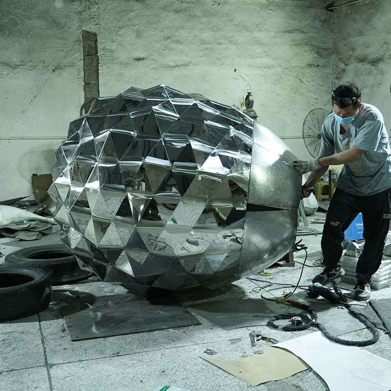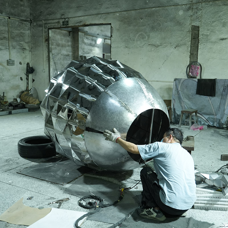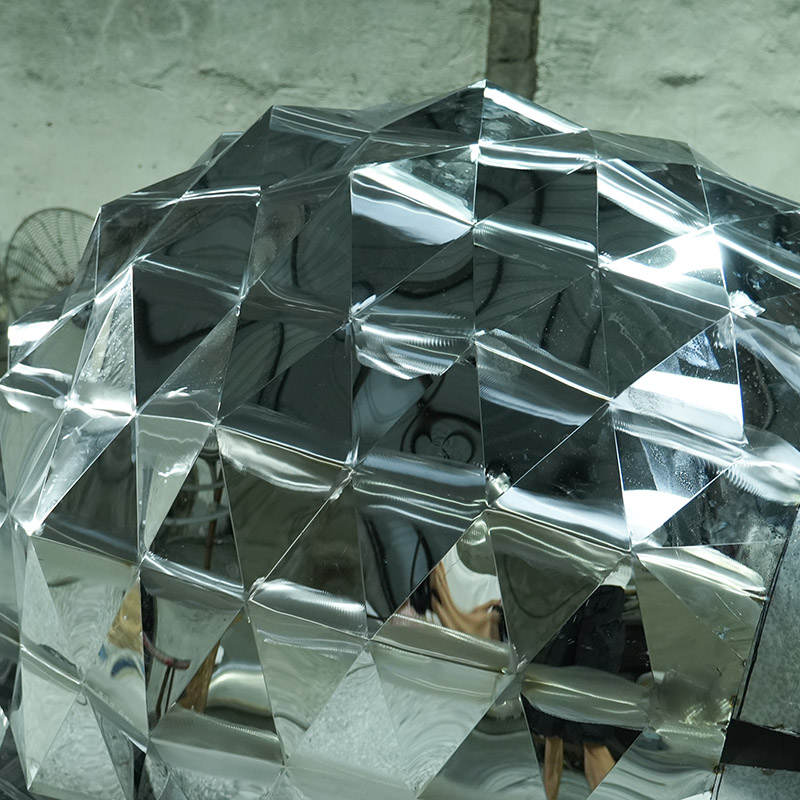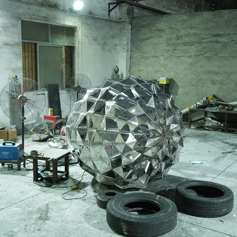 This stainless steel diamond ball sculpture is a bold and creative geometric work of art, made from faceted stainless steel panels, shaped like a beautifully cut diamond. The sculpture’s finely polished surface reflects light and the surrounding scenery, creating a gorgeous and ever-changing visual effect.
