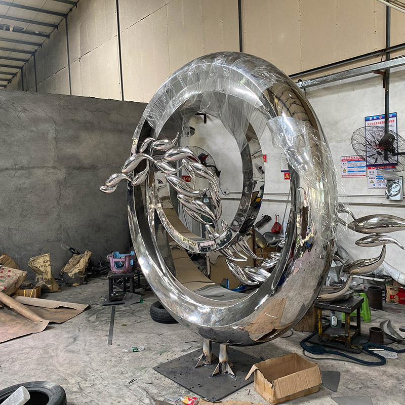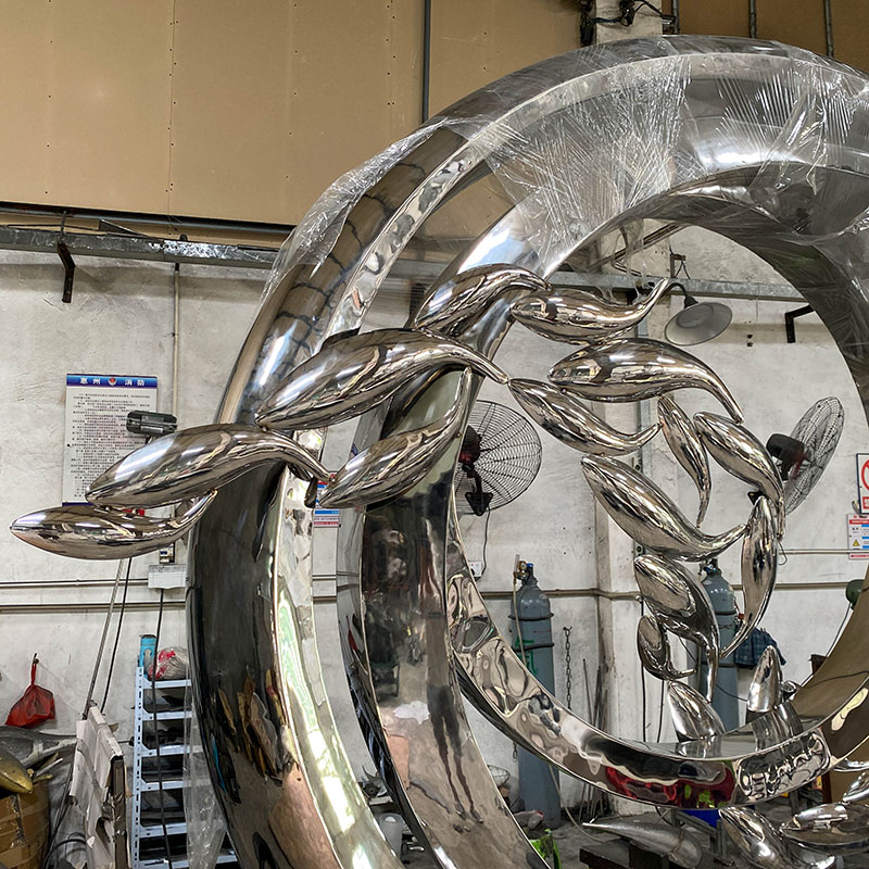 Fish Ring Dance is a modern stainless steel sculpture featuring a ring structure and elegant abstract leaf or fish designs. Its smooth metal surface and flowing lines complement each other and are suitable as a landmark art installation in a courtyard, hotel or office building, symbolizing the cycle of life and eternal vitality.