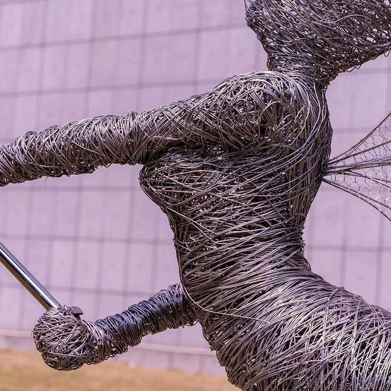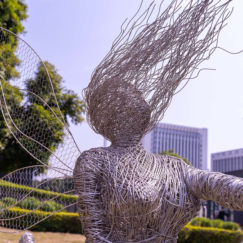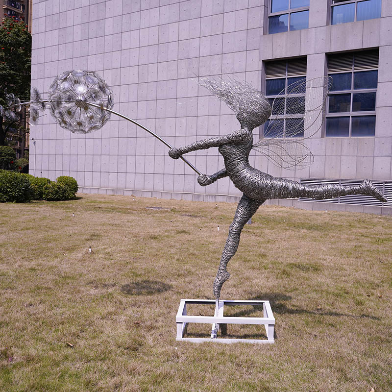 “Dream Chaser” is a modern sculpture full of agility and fantasy, showing the light moment of a fairy chasing a dandelion. Its unique line design and delicate metal weaving give the space a dreamy and dynamic feel. The sculpture is made of weather-resistant metal material and is suitable for gardens, courtyards or public art displays.