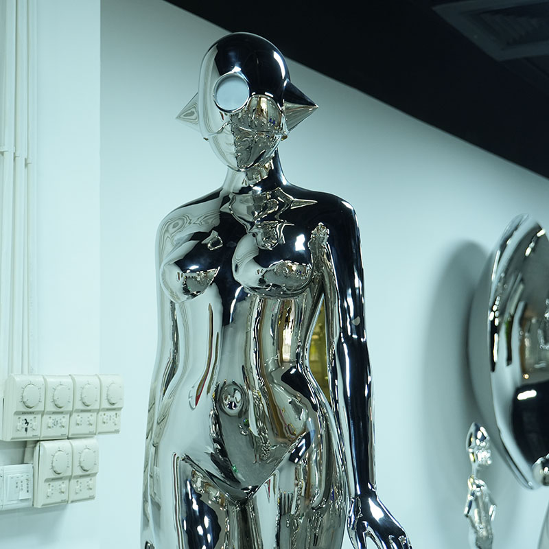 The “Future Silver Goddess Stainless Steel Sculpture” is a stunning piece of modern art that seamlessly blends technology and aesthetics. Crafted from high-quality stainless steel, this sculpture features a highly polished, mirror-like finish that reflects its surroundings, creating a unique and captivating visual effect