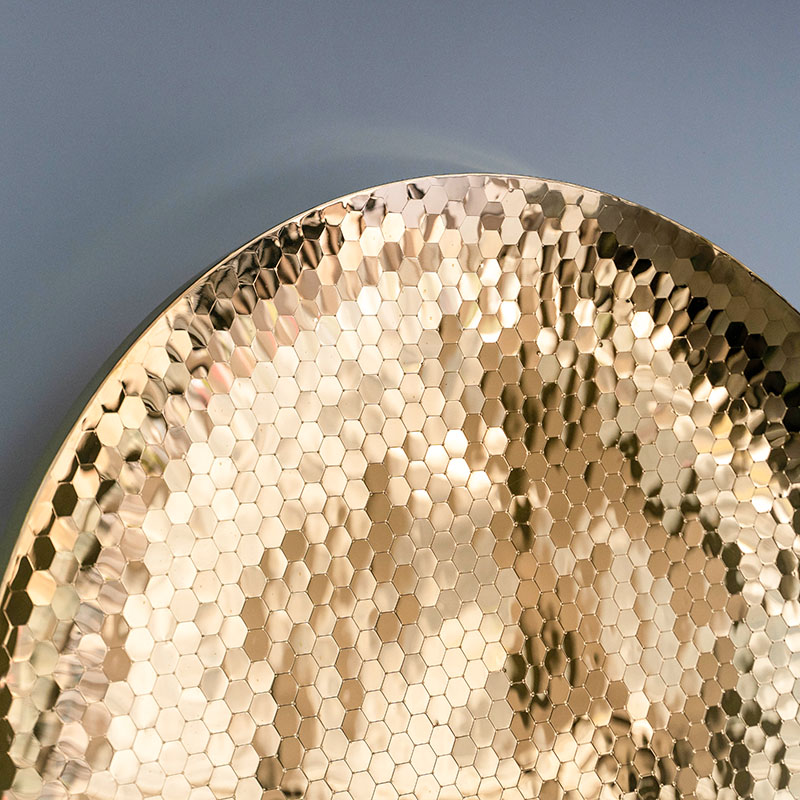 Honeycomb Light is an exquisite metal decorative plate with a honeycomb polished surface, showing a charming golden luster. Each honeycomb texture is finely polished to reflect elegant light and shadow effects. As a wall decoration, this decorative plate can bring a modern artistic elegance to your space. It is the only choice for those who pursue quality and design, adding a touch of luxury to your home or office.