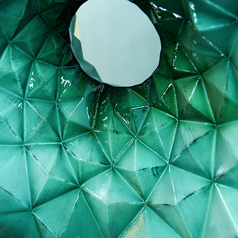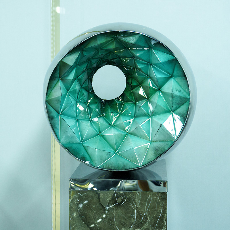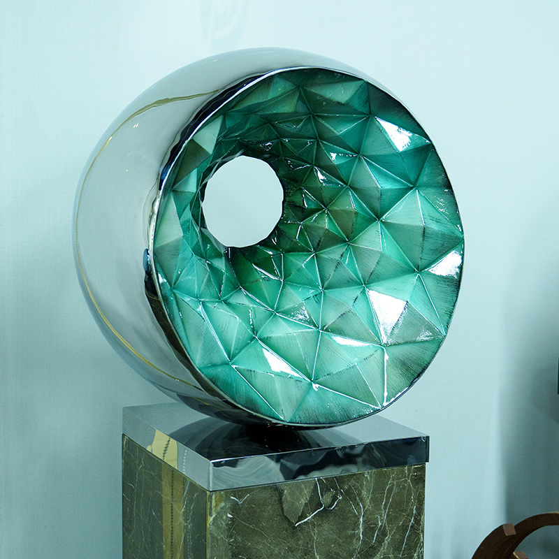 Jade Heart is a unique modern stainless steel sculpture that combines geometric structure with soft emerald green tones to create a stunning visual effect. The circular opening in the center of the sculpture symbolizes endless possibilities, and the polyhedron design inlaid on the surface adds three-dimensionality and depth to the sculpture, as if it contains the infinite energy of nature. Suitable for placement in halls, art exhibition spaces or outdoor courtyards, it will add a touch of elegance and modernity to your environment.