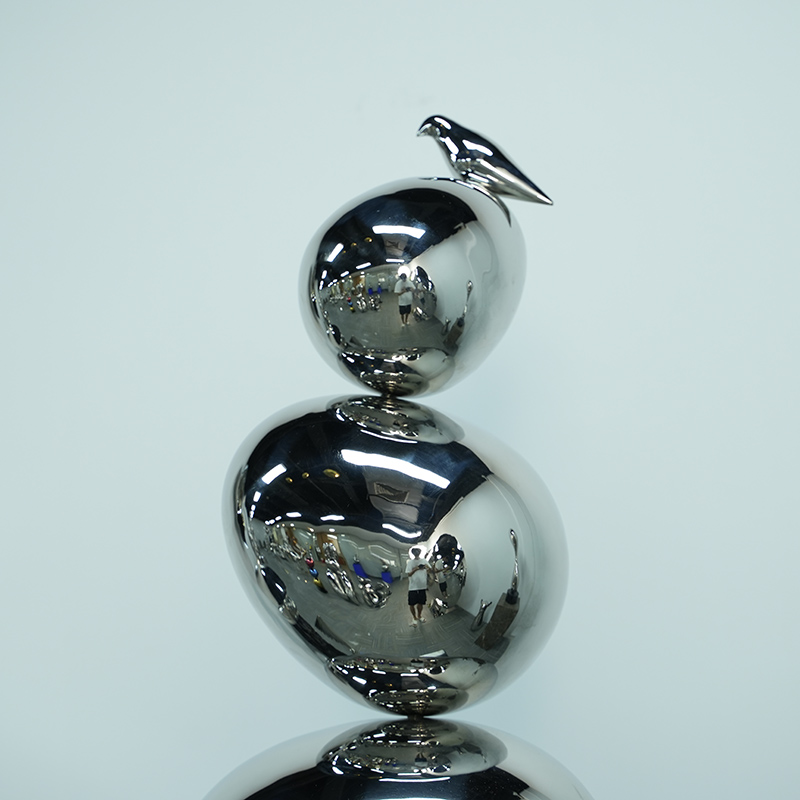 “Balanced Realm” is a metal sculpture that combines modern design with natural elements, reflecting perfect balance and harmony. The sculpture consists of four smooth metal spheres stacked together, with a bird perched on the top sphere, symbolizing the delicate balance between the tranquility of nature and the precision of industry. This sculpture is not only a work of art, but also a spiritual symbol.
