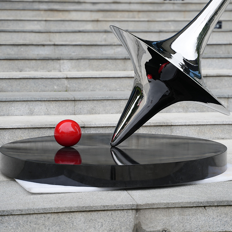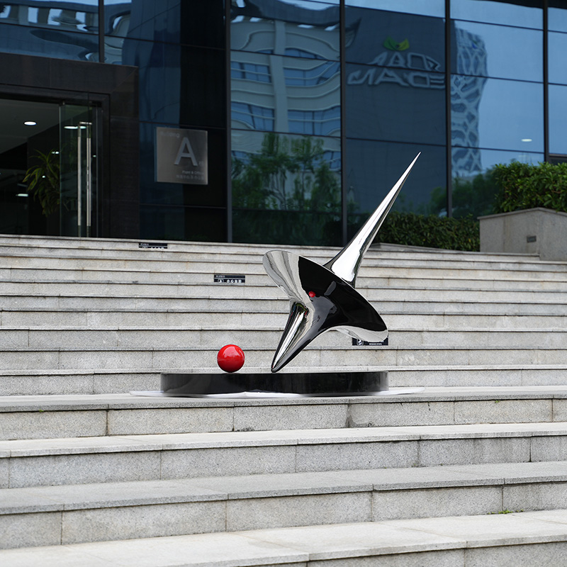 The “Rhythm of Spin” metal sculpture is a unique modern art piece made of high-quality stainless steel and inspired by a spinning top. Its smooth lines and dynamic shape add a touch of modern art to any outdoor space. The bright red sphere of the sculpture adds a vivid touch of color to the overall design, making it suitable for decoration in public spaces, commercial places or private gardens.