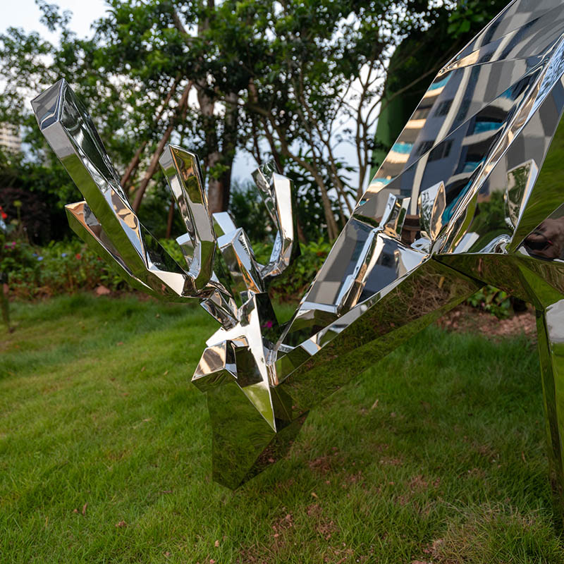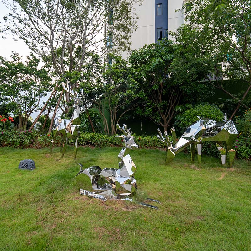 This group of modern stainless steel sculptures, named “Glittering Deer”, shows the elegance and agility of deer through unique geometric design. The high-gloss stainless steel material makes it shine in the sun, suitable for decoration in gardens, parks or public art spaces. Its modern shape blends perfectly with the natural environment, adding a harmonious beauty of art and nature to your space.
