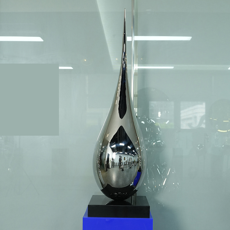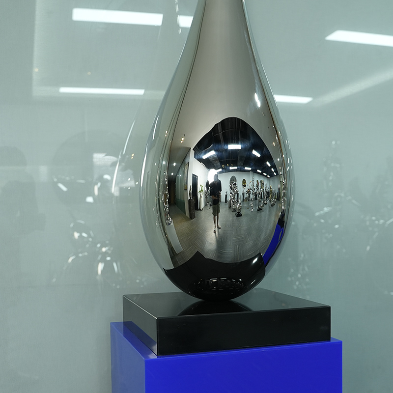 This stainless steel sculpture named “Rhyme of Silver Drop” gives the space a unique sense of elegance with its smooth water drop shape. The sculpture is made of high-quality stainless steel and the surface is finely polished, showing a mirror-like luster and perfect reflection effect, as if integrating the entire space into it.